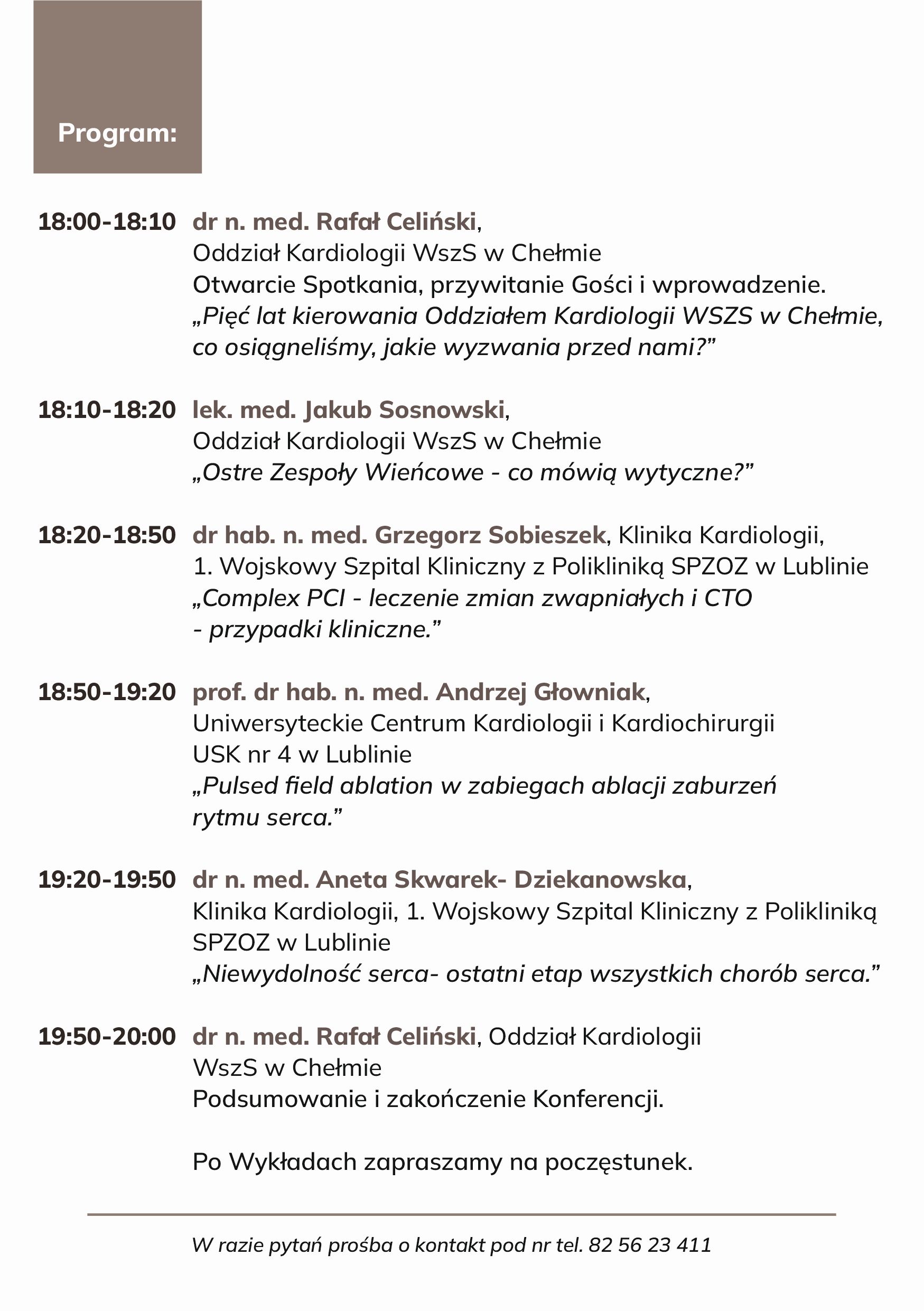 18:00 do 18:10, dr n. med. Rafał Celiński, Otwarcie spotkania, przywitanie Gości i wprowadzenie, „Pięć lat kierowania Oddziałem Kardiologii WSzS w Chełmie, co osiągnęliśmy, jakie wyzwania przed nami?”